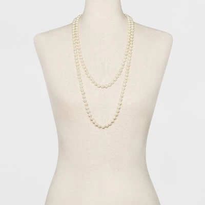 Add some sophistication to your outfit instantly with this Long Faux-Pearl Necklace from A New Day™. This layered pearl necklace features two strands, and looks great its own or paired with other jewelry. Dress this long pearl necklace up with a flowy blouse and pencil skirt or dress it down with a button-down chambray dress — however you style it, you’re sure to look chic.