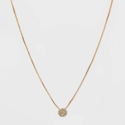 Keep yourself accessorized everyday with the simple yet elegant style of the Pave Circle Pendant Necklace from A New Day™. This gold-tone pendant necklace features a pave circle pendant dangling down at the center of the linked chain for a beautiful look. Easy to mix and match with your outfits, this nickel-free necklace suits all types of skin. You can wear it as a solo piece or add matching gold-tone earrings and a bracelet.