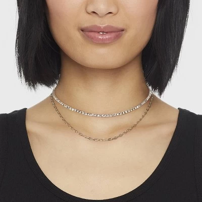 Add a layered staple piece to your jewelry collection with this Two-Row Rhinestone Chain Necklace from A New Day™. The princess length of each of these paired necklaces flatters your collarbone, and a gold finish makes them easy to pair with nearly anything in your wardrobe. One is a string of gold plates studded with rhinestones, giving it an elegant, feminine look. The other is made up of simple chain links for a coordinated style. Mix and match them for a variety of outfits that are uniquely you. The lobster claw clasp offers a secure fit, and the nickel-free construction makes them suitable for most skin types.