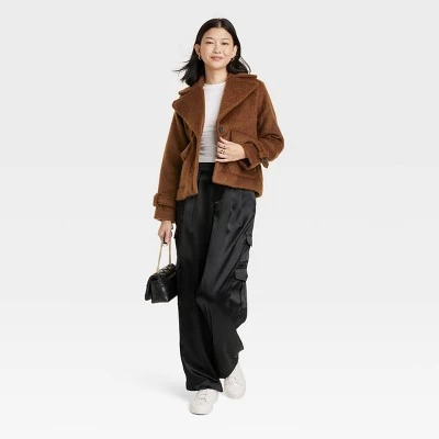 Channel your inner retro diva with this Faux Utility Jacket from A New Day™. Falling below the waist, this solid-color jacket with a fuzzy finish is made of lightweight fabric with wool and full lining for cozy warmth. It’s tailored in a regular fit with a front two-button fastening and long sleeves with buttoned bands on the ends. The distinct oversized notched collar lends retro vibes, and roomy patch pockets with flaps on the front complete the design with utility-inspired flair.