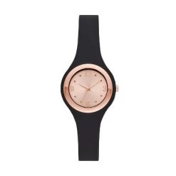 Keep track of time with this sleek and stylish Rubber Unibody Strap Watch from A New Day™. This pretty timekeeper comes with a round, rose gold face and a slim rubber strap for a pop of contrast, leaving you with a chic, minimalist look. Analog display keeps track of time down to the very second, while the adjustable buckle strap ensures a snug and secure fit against your wrist. The solid strap pairs easily with almost any outfit in your closet.